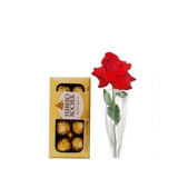 Este lindo arranjo contém três botões de rosas nacionais vermelhas e uma caixa de Ferrero Rocher com oito unidades. As rosas são frescas e selecionadas com cuidado para garantir a máxima qualidade e durabilidade.