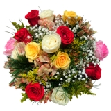 Este lindo buquê inclui seis rosas brancas nacionais e astromélias variadas, em um arranjo delicado e elegante.