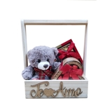 Cesta de madeira com ursinho pequeno, bombom ferrero rocher collection com 07 unidades de 77g e Ferrero Rocher com 08 unidades 100g.